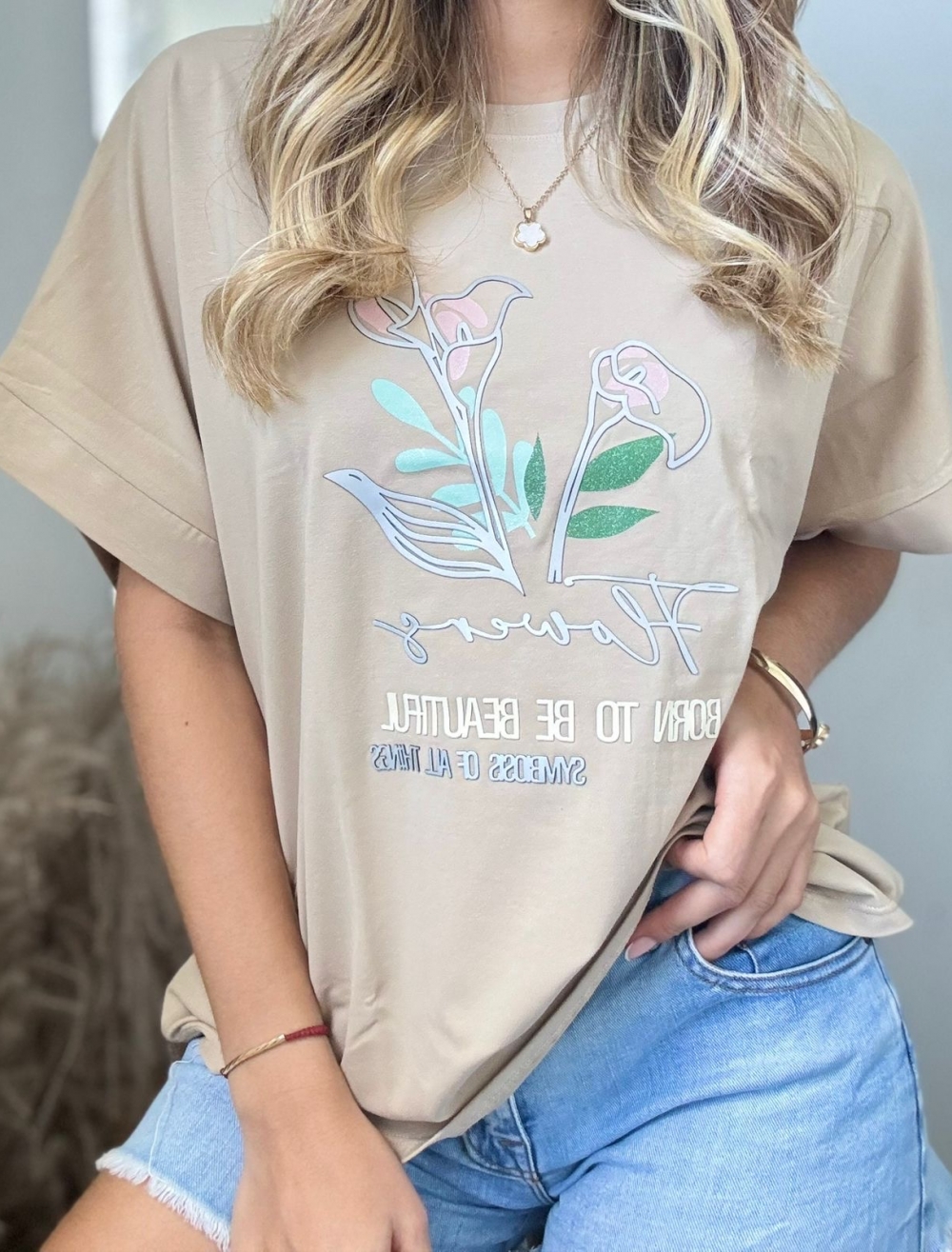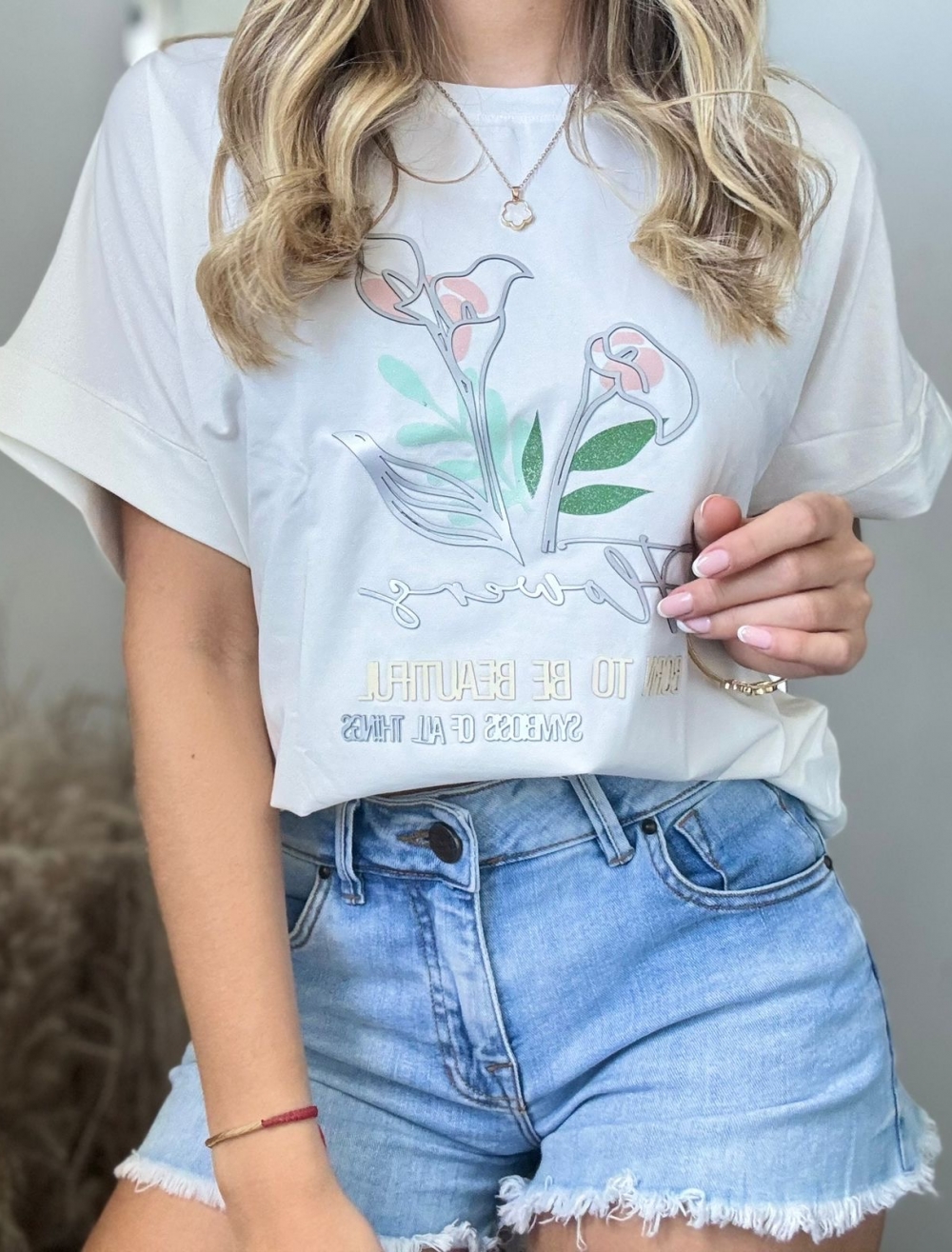 CAMISETA CUELLO REDONDO FLOWERS RELIEVE PLATEADO