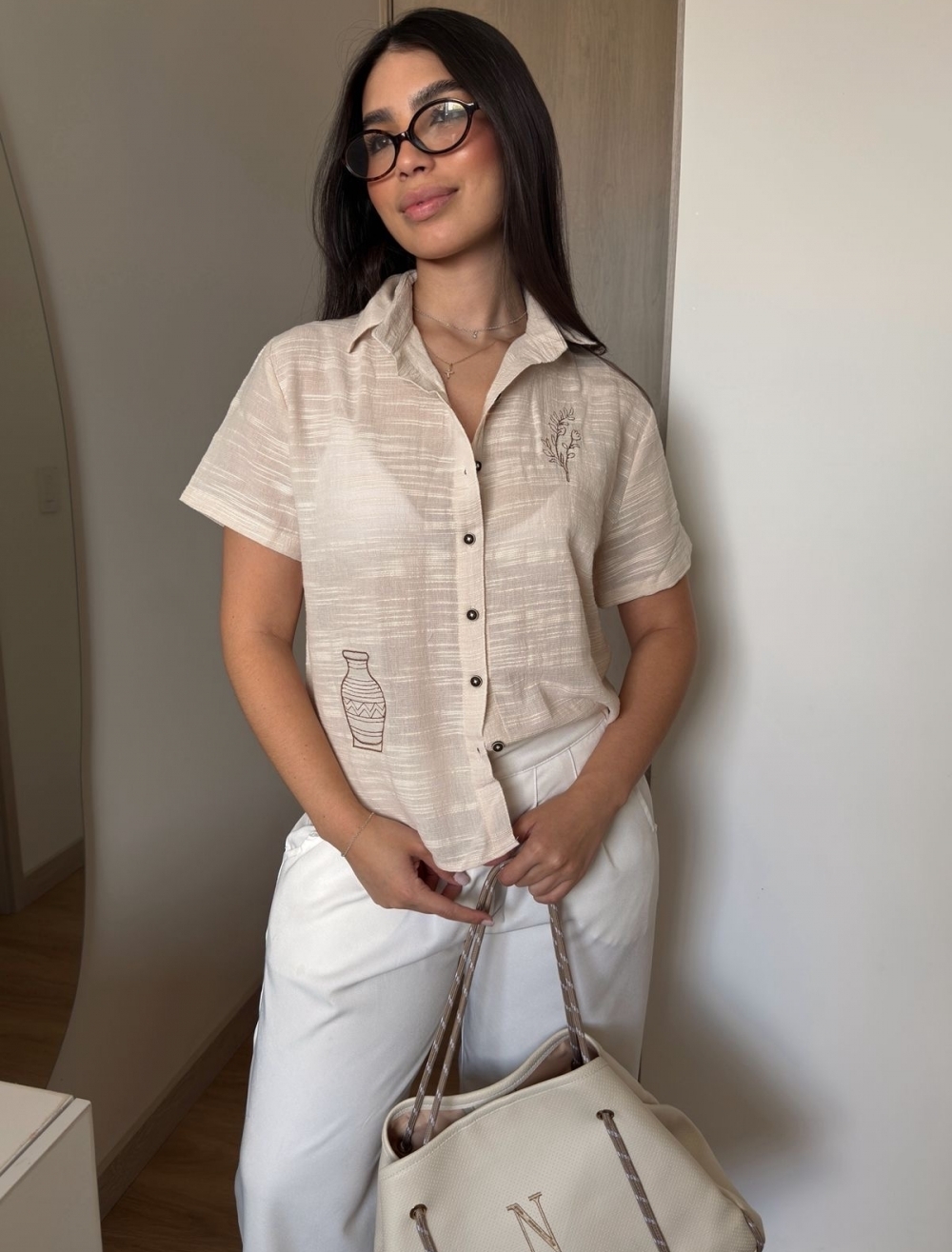 • Detalles: Bordados minimalistas en frente (motivo botánico y vasija) y botones oscuros en contraste.