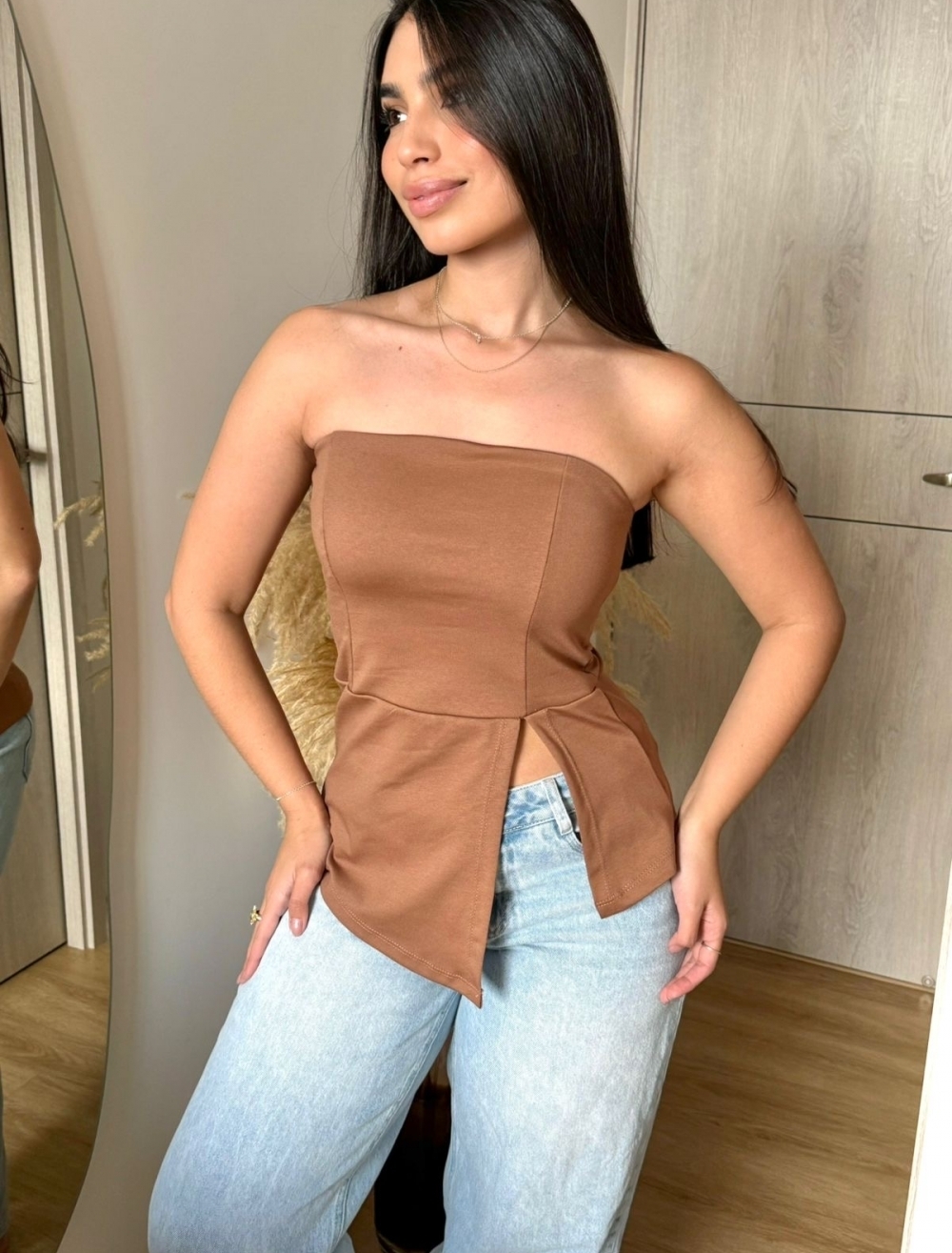 Descripción Nuestro Top Strapless Slit es una declaración de estilo y seguridad. Diseñado con una silueta tipo corsé que enmarca el torso, destaca por su abertura frontal asimétrica que aporta movimiento y modernidad a la prenda. El color rojo intenso y la estructura de la tela Qatar lo convierten en el complemento ideal para tus jeans favoritos o pantalones de tiro alto, logrando un equilibrio perfecto entre lo casual y lo sofisticado.