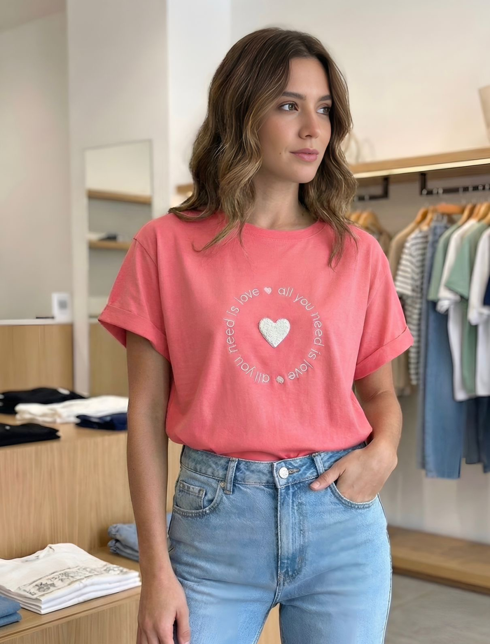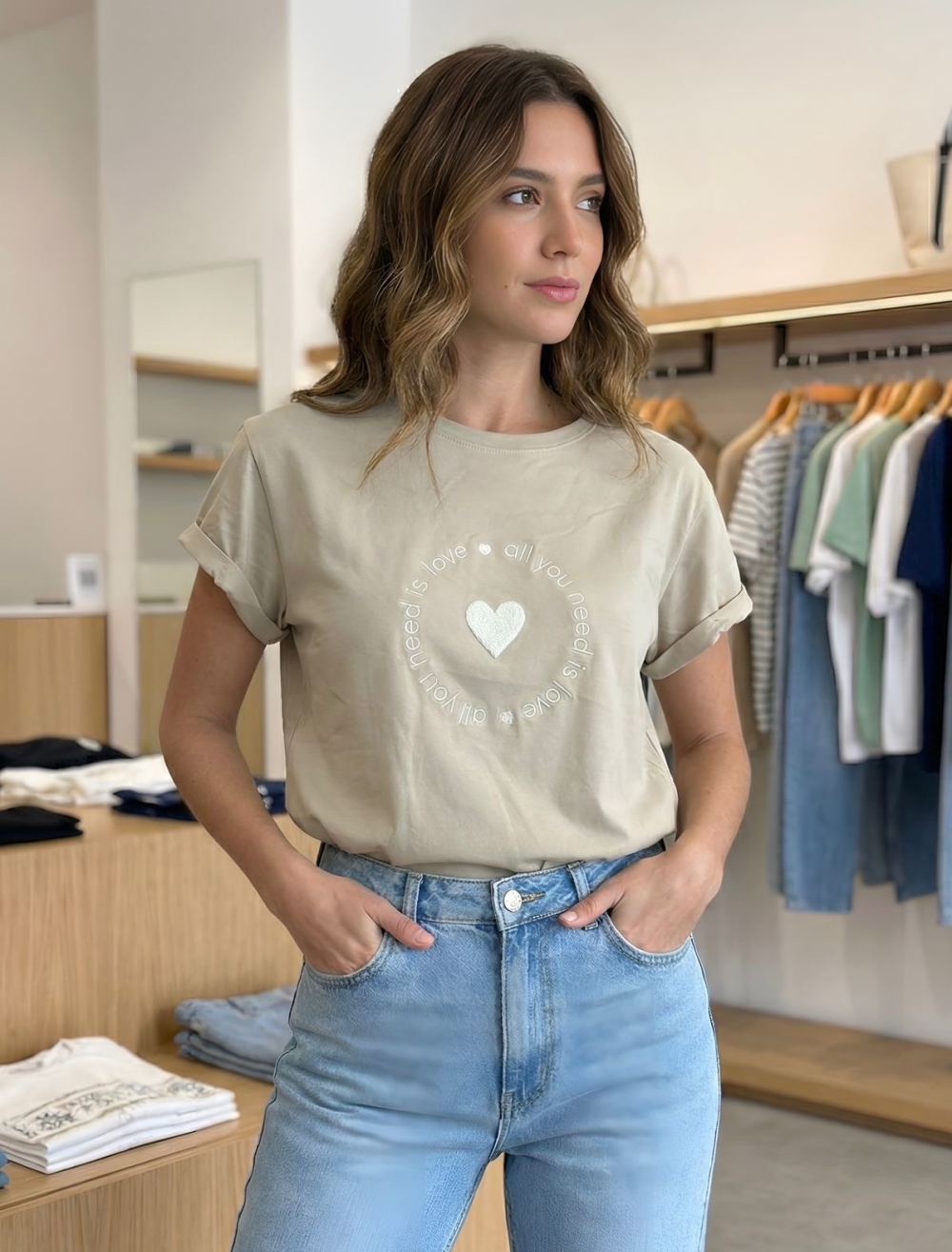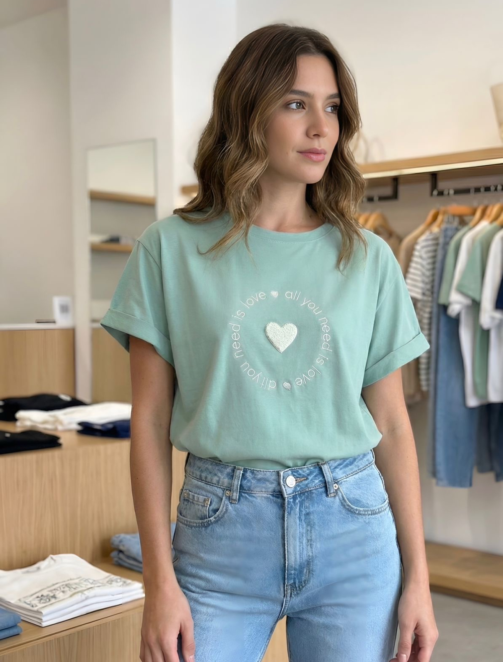Camiseta femenina en algodón liviano con elongación, diseño minimalista y bordado decorativo en el frente. Silueta cómoda, versátil y fácil de combinar. Ideal para looks casuales y urbanos.
